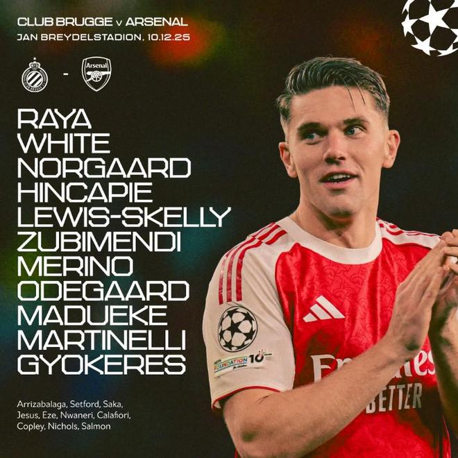 北京时间12月11日4:00,欧冠联赛阶段第6轮,阿森纳作客扬-布雷德尔球场挑战布鲁日,本场主裁判为雅布隆斯基,赛前双方首发出炉。