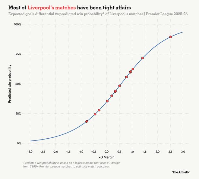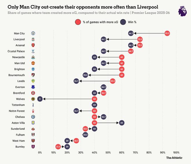 近日,The Athletic发表专题文章,深入分析了利物浦本赛季在英超联赛中面临的核心矛盾:尽管球队在超过八成的比赛中创造了比对手更多的得分机会(预期进球值占优),且该项数据高居欧洲前列,其实际联赛排名却仅列第十,与榜首差距达十分。文章通过系统对比历史数据与比赛状态分析指出,利物浦的困境远非“运气不佳”可简单概括——球队在落后时攻防失衡的战术模式、关键局中微弱优势的转化乏力,以及与维拉等队面对逆境时截然不同的比赛控制力,共同揭示了其“得势难得分”的深层结构性症结。