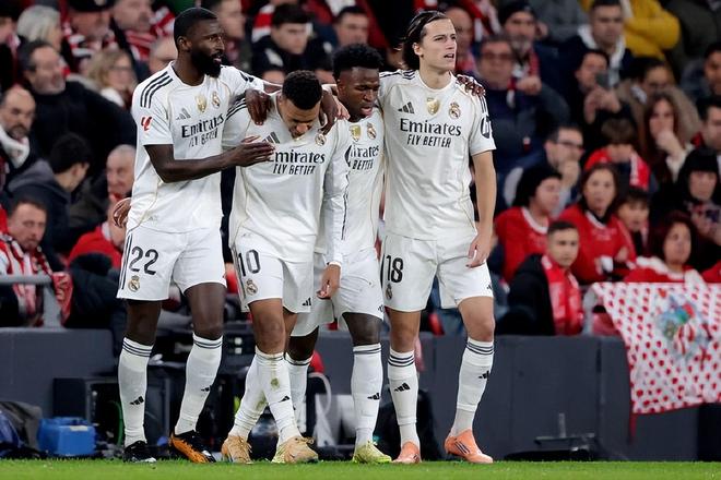 毕尔巴鄂竞技上赛季拿到西甲前五,得以重返欧冠,不过也因为受限于双线作战,巴斯克雄狮成绩明显下滑;为了避免继续不胜,阿隆索这场比赛变阵4-4-2:维尼修斯、姆巴佩双前锋;贝林厄姆、巴尔韦德、卡马文加、楚阿梅尼搭档中场组合;阿诺德、米利唐、吕迪格、阿尔瓦罗-卡雷拉斯联袂防线,库尔图瓦镇守球门。